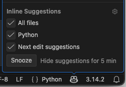 If we select the Copilot icon again in the status bar, we can see the current inline settings: